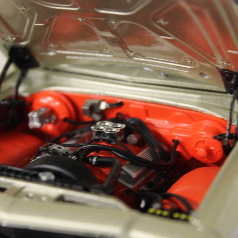 The 350 ci V8 engine with 4 barrel carburetors sits in a bay of orange brilliance.