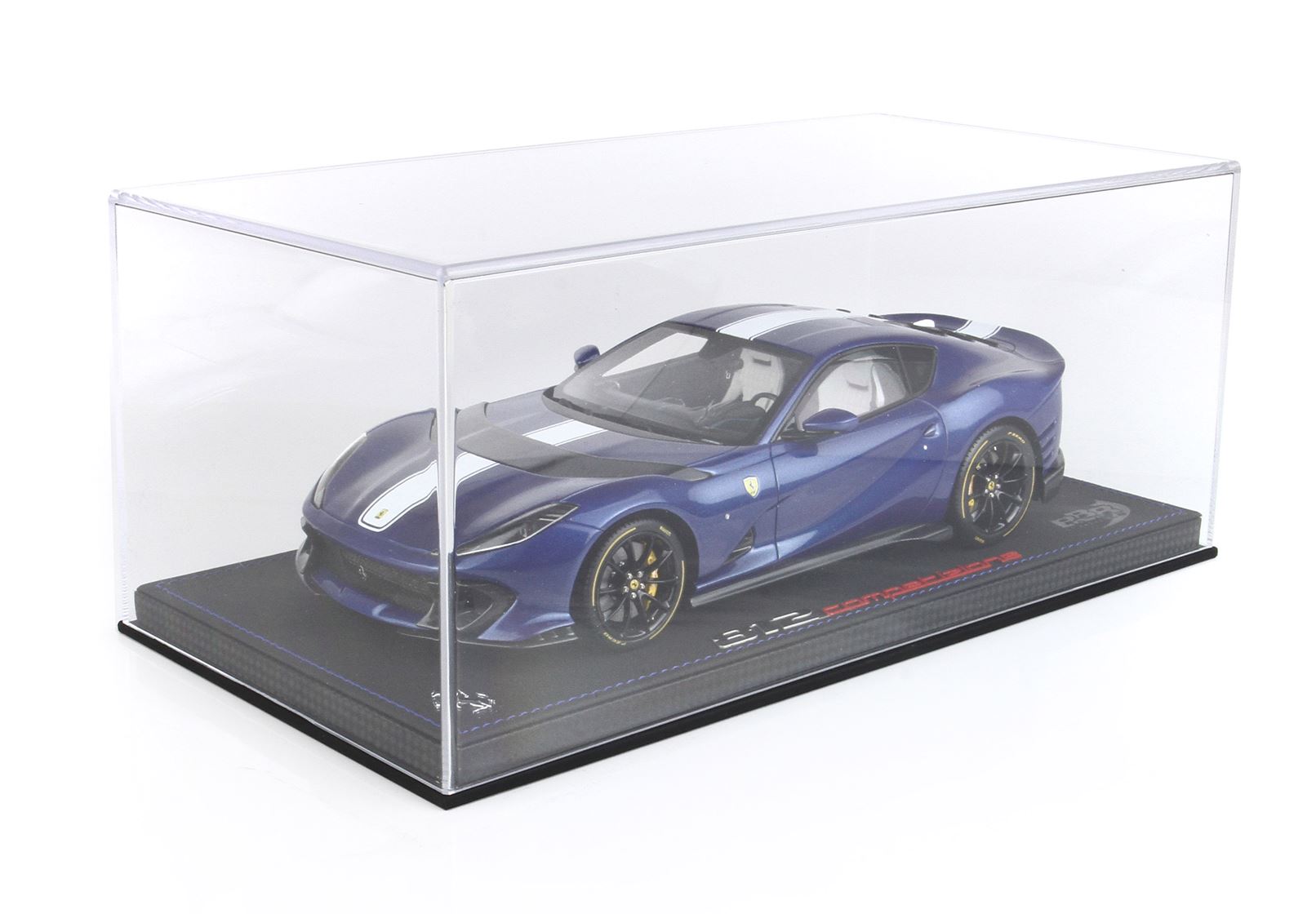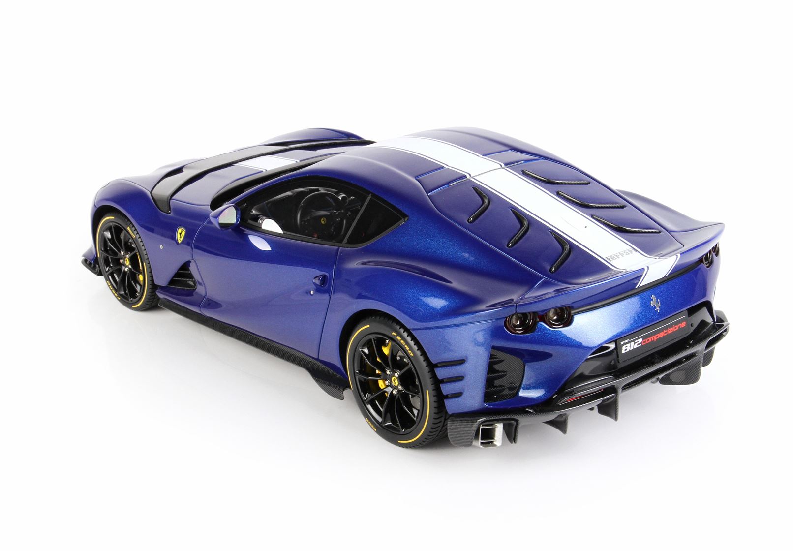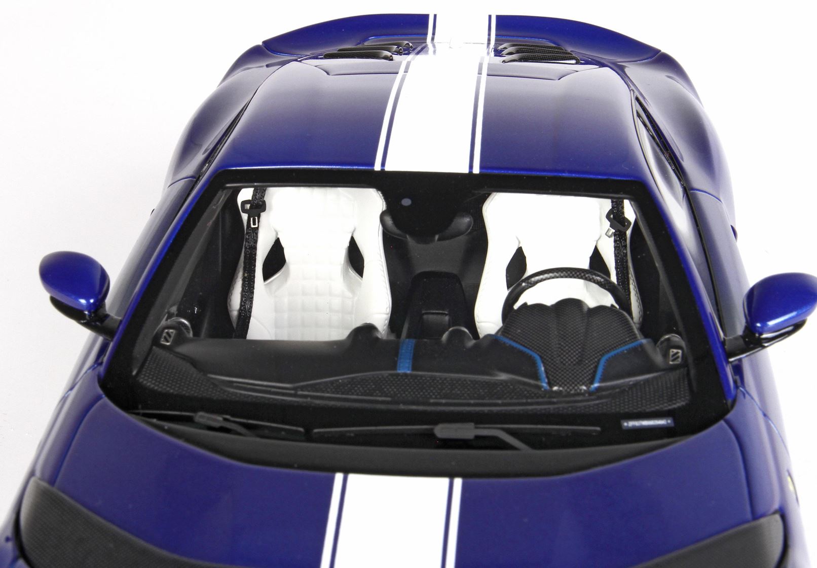Blue Tour De France colour complemented by the white stripe, matt black interior and white seats. The dashboard is replicated in carbon fibre and features the blue stripes, which on the real car is an optional extra.