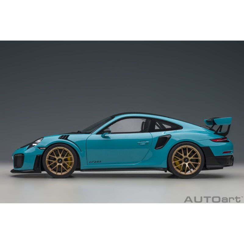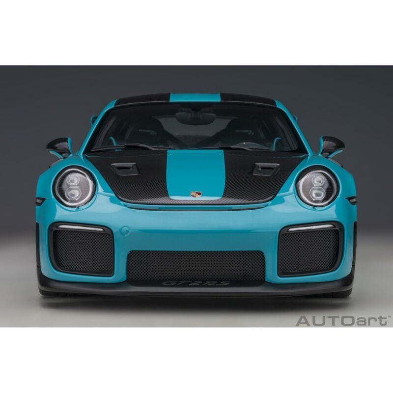 This Porsche 911 GT2 RS (991.2 Weissach Package 2017) composite model car is miami blue and features working wheels steering and opening doors boot bonnet. It is made by AUTOart and is 1:18 scale